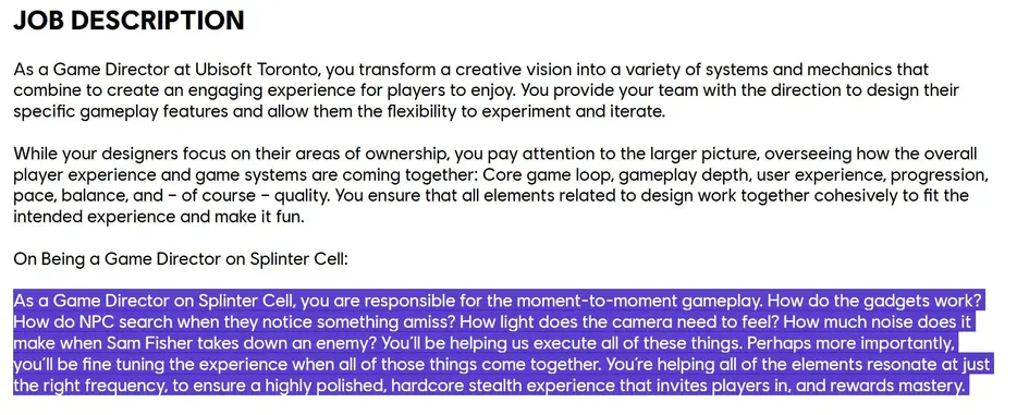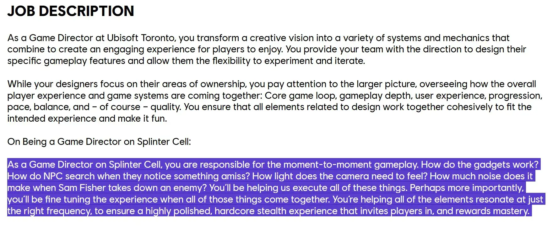 Ubisoft Toronto ищет нового геймдиректора для проекта. Согласно описанию вакансии, новый директор будет отвечать за ключевые аспекты игры, включая игровой процесс, внедрение гаджетов и поведение неигровых персонажей.
