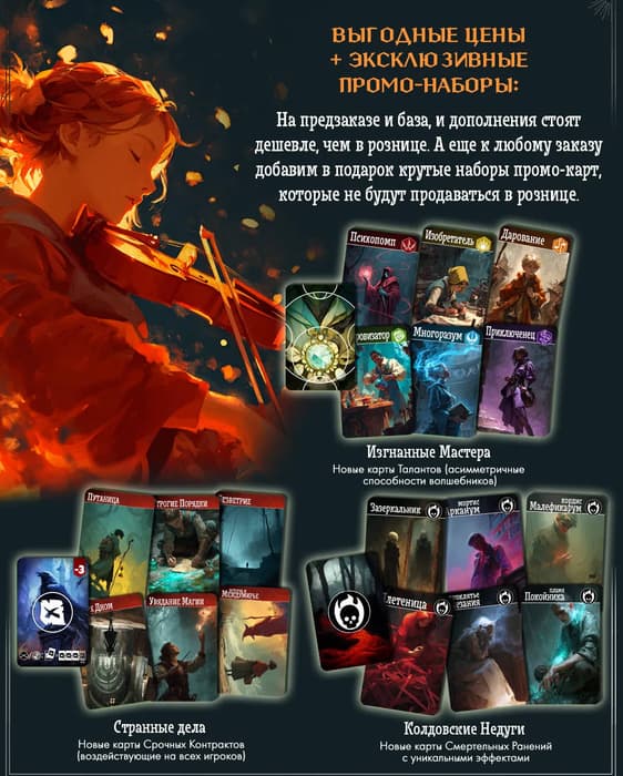 Также благодаря специальной акции базовую игру сейчас позволят приобрести за 4190 рублей, а комплект с базой и дополнением – за 6390 рублей. К любому заказу команда добавит в подарок особые наборы промо-карт – «Изгнанные Мастера», «Странные дела» и «Колдовские Недуги», которые не будут продавать в рознице.