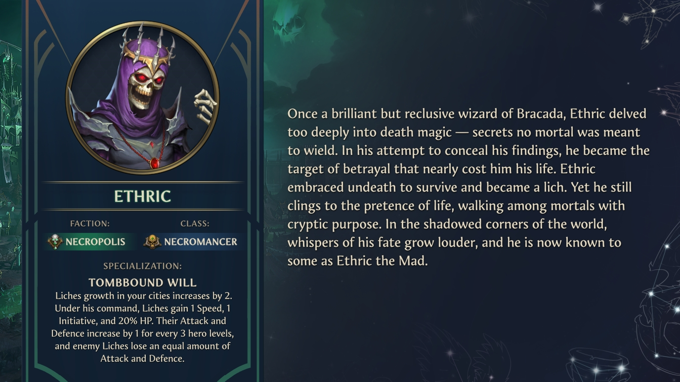 Этрик. Фракция: Некрополь .Класс: Некромант ||| Когда-то блестящий, но замкнутый маг Бракады, Этрик, слишком глубоко погрузился в магию смерти – тайны, которыми не должен был владеть ни один смертный. Пытаясь скрыть свои открытия, он стал жертвой предательства, которое едва не стоило ему жизни. Этрик принял нежить, чтобы выжить, и стал личем. И всё же он продолжает цепляться за видимость жизни, бродя среди смертных с таинственной целью. В тёмных уголках мира всё громче слышны шёпоты о его судьбе, и теперь некоторые называют его Этриком Безумным.