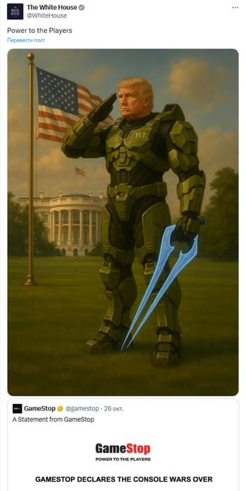 Публикация стала реакцией на заявление GameStop о завершении «консольной войны» после сообщения о том, что игра серии Halo впервые выйдет на PlayStation. Белый дом с долей иронии намекает, что Трамп тоже причастен к завершению «войны».