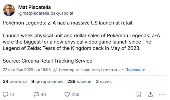 По данным аналитика Мэта Пискателлы из Circana, Pokémon Legends: Z-A стала крупнейшим физическим релизом в США со времён The Legend of Zelda: Tears of the Kingdom. Это особенно впечатляет, учитывая, что часть аудитории ждала покупки до выхода Switch 2.