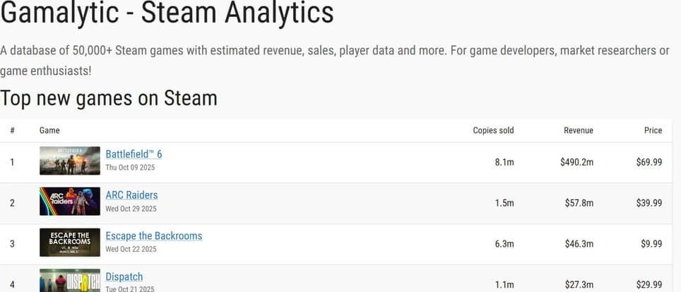 По данным аналитического портала Gamalytic, многопользовательский экстракшн-шутер Arc Raiders от Embark Studios продан более 1,5 млн копий только в Steam за первые три дня после релиза. Игра принесла почти $60 млн дохода, не считая продаж на PS5 и Xbox Series.