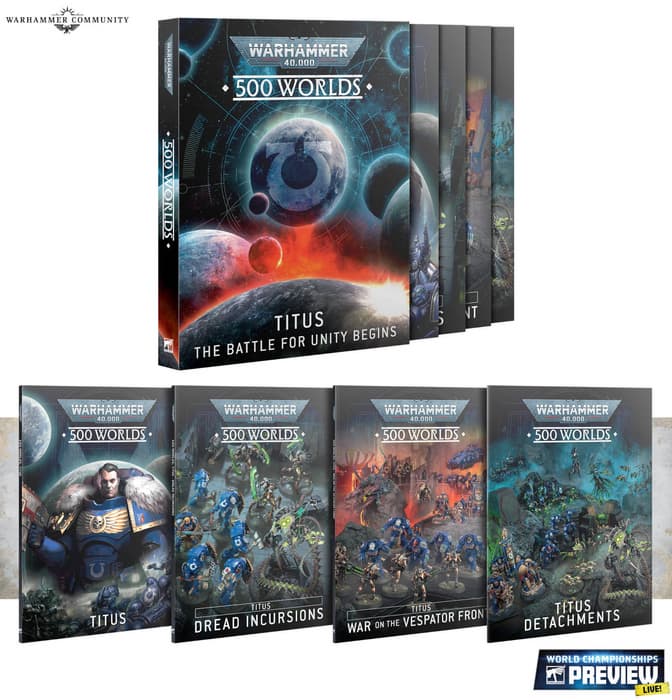 Завезут миниатюру осколка К'тан (Несущего Ночь) из Warhammer 40,000: Kill Team. Появится набор из четырех книг в декоративном футляре «500 миров: Тит». Помимо основной книги, наполненной лором, фотографиями миниатюр и иллюстрациями, в пак входит «Война на фронте Веспатора» – полная система кампаний для Warhammer 40 000, в которой три альянса сражаются за контроль над территориями и захват ключевых точек на большой карте кампании, включённой в набор.