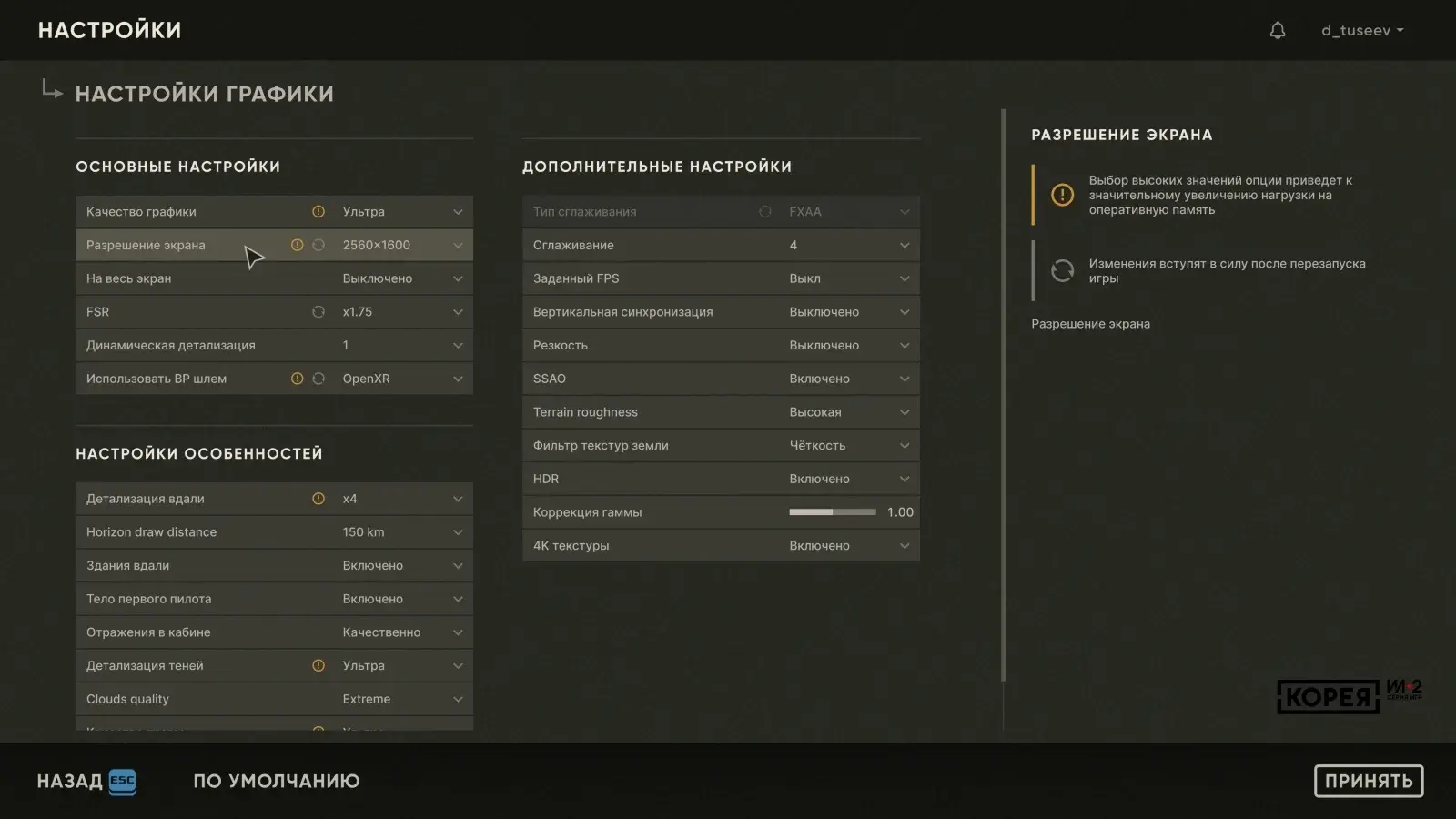 В настройках мы постарались учесть те пожелания и замечания, которые игроки высказывали по опыту игры в «Великие сражения». Так, в настройках графики сделана более логичная группировка, добавлены значки и подсказки, помогающие оптимальным образом настроить игру. Появились такие опции, как выбор API виртуальной реальности (Open VR или Open XR), степень масштабирования изображения по технологии FSR, включение отображения тела пилота при виде от 1-го лица, специальный оптимизированный под VR пресет графики.