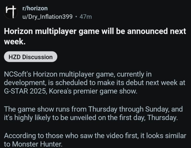 По слухам, Sony и Guerrilla Games готовы анонсировать мультиплеерную Horizon Online, связанную с приключениями Элой. Предполагается, что официальный показ состоится на следующей неделе в рамках G-STAR 2025, крупнейшего корейского игрового события.