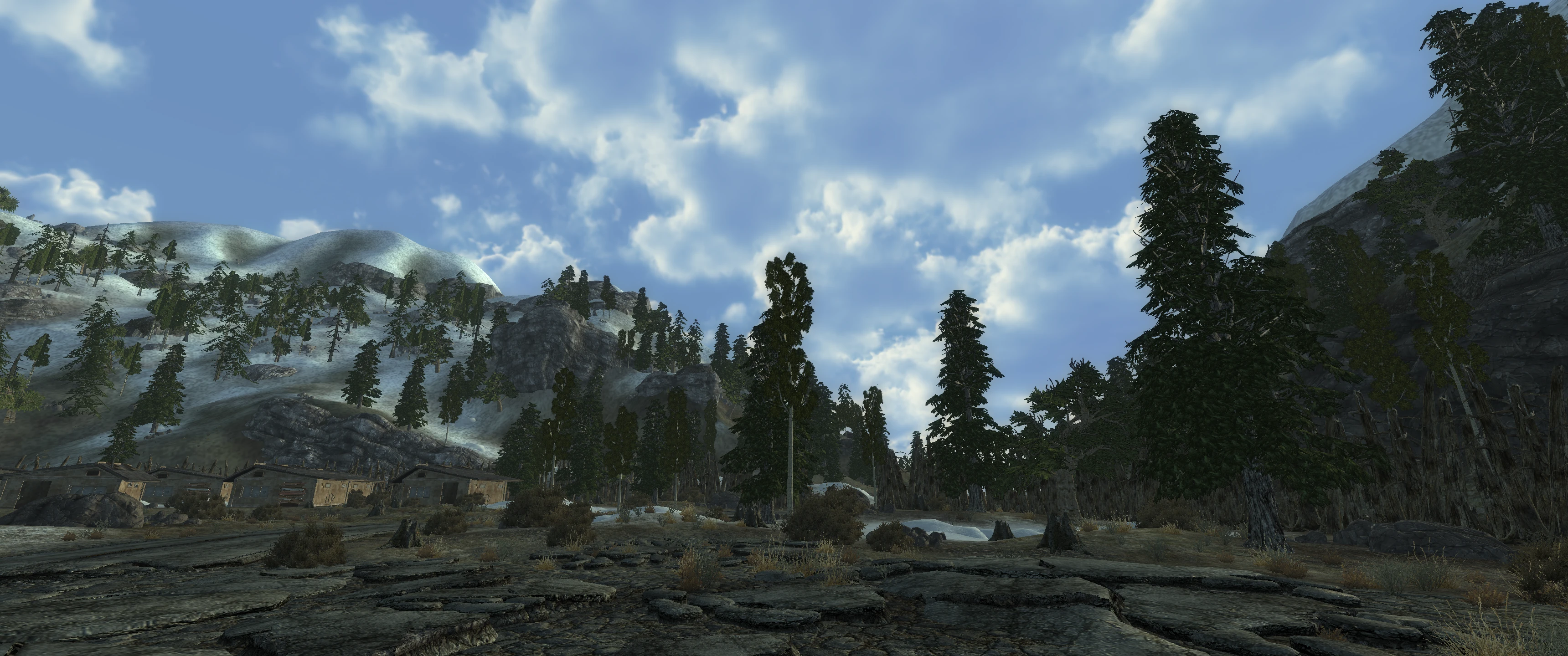 облака также были "запечены" в две отдельные текстуры, одна из которых имитирует освещение от солнца или луны, а другая — рассеивание света в небе. Это означает, что одна и та же текстура облаков может имитировать несколько времён суток и интегрироваться с любым местоположением, поскольку не "запекается" информация, привязанная к времени или местоположению. Эта система более продвинута, чем та, что в Fallout 4. Для создания плагинов ESP был использован скрипт, который извлекает освещение из каждой погоды и времени суток по отдельности.