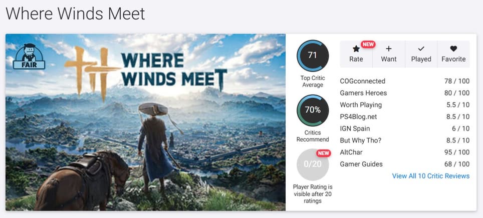 Where Winds Meet выйдет сегодня, но первые отклики показывают, что с релизом явно поспешили. Рецензии появились заранее и сводятся к усреднённому результату около 71%. При этом оценки скачут: одни журналисты ставят 9,5 из 10, другие опускают планку до 5,5 из 10.