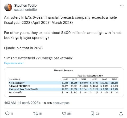 По расчётам EA, в период с 1 апреля 2027 года по 31 марта 2028 года годовой чистый доход должен значительно вырасти. Такое случается только тогда, когда издатель готовит релиз крупного блокбастера, который способен подтолкнуть продажи всей компании.
