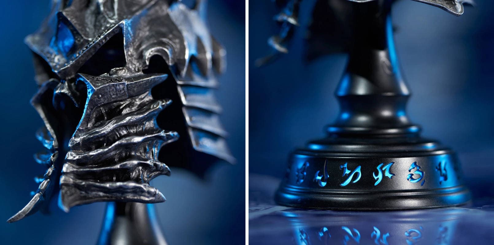 Каждая часть реплики тщательно проработана и окрашена вручную. Покрытие под металл имитирует холод и ледяную атмосферу, характерную для тематики Короля-лича. На платформе, обладающей светодиодной подсветкой, красуются характерные руны, узоры и уникальный номер лимитированной коллекции.