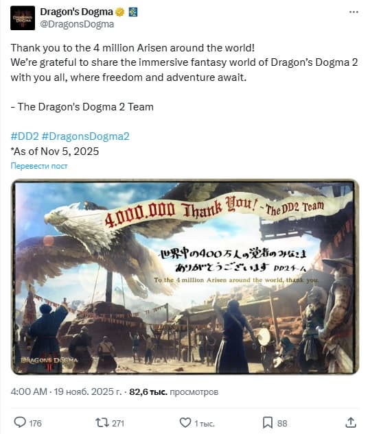 Спасибо четырём миллионам Пробуждённых по всему миру! Мы рады поделиться захватывающим фэнтезийным миром Dragon's Dogma 2, где вас ждут свобода и приключения.