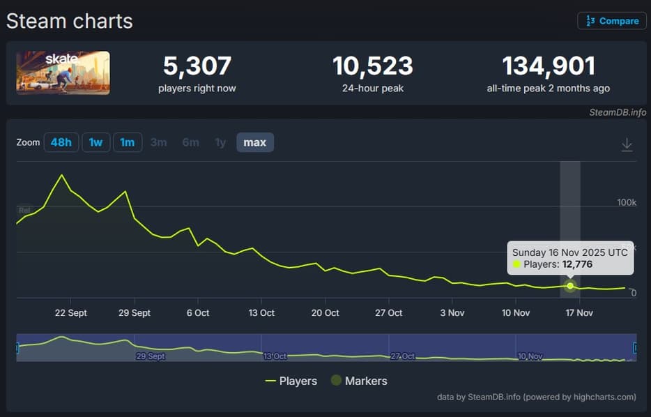 На старте 21 сентября на платформе зарегистрировали 134 901 активного игрока, а сейчас пиковое количество за сутки не превышает 12 000. Это подтверждает резкое падение интереса, но стоит учитывать, что Skate также доступна на PlayStation и Xbox.