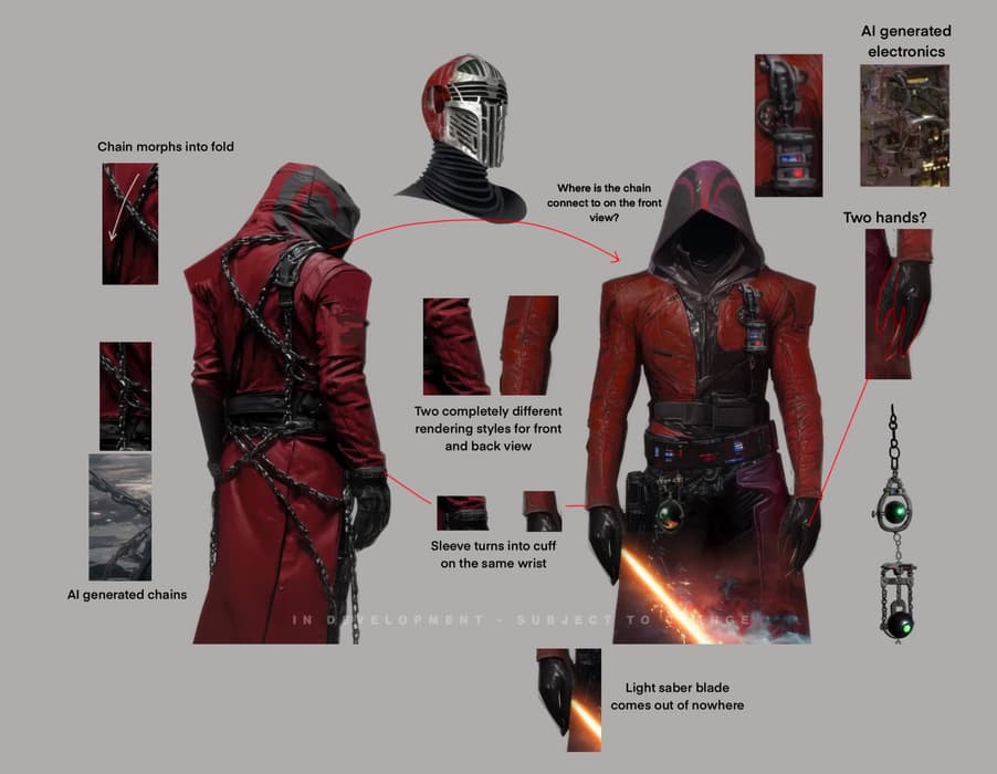 Пользователь MGecko117 указал на конкретные проблемы на своей странице в социальной сети X: цепи, меняющие форму и превращающиеся в складки ткани; разные стили рендеринга спереди и сзади; искаженная электроника на груди; двойная кисть; появившийся из ниоткуда световой меч без рукояти; общие несоответствия текстур, типичные для ИИ.