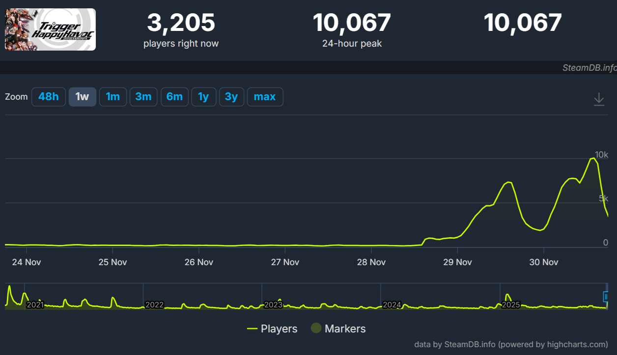 В конце ноября онлайн Danganronpa: Trigger Happy Havoc резко взлетел. До недавнего момента он был на уровне 100 - 200 игроков, а недавно он превысил 10 тысяч игроков, что является новым абсолютным рекордом.