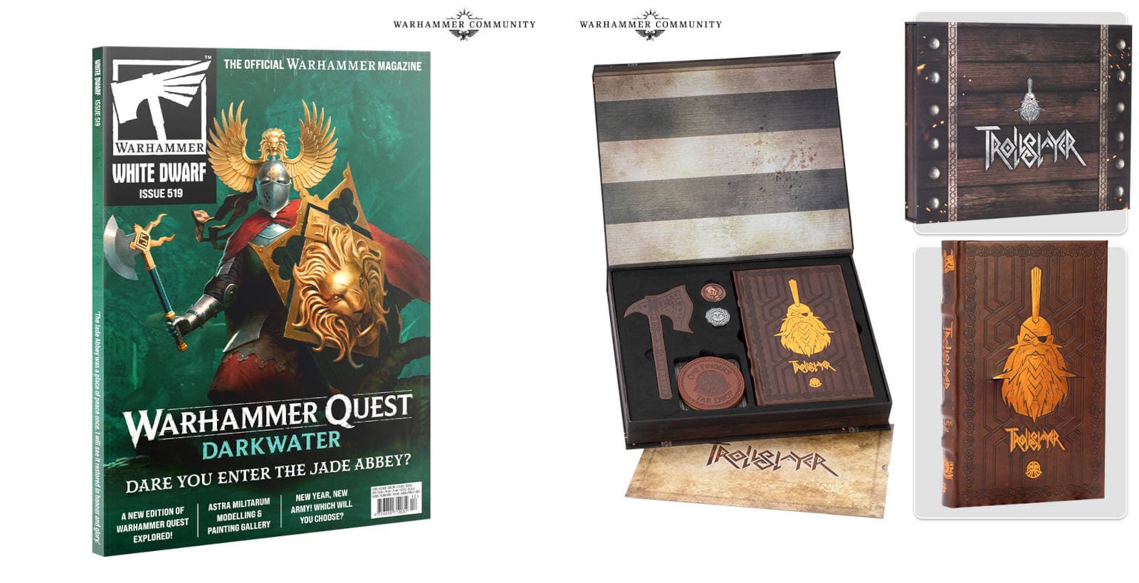 Вдобавок ко всему, получится предзаказать 519 выпуск журнала White Dwarf и лимитированное издание книги «Истребитель троллей» от Уильяма Кинга с двумя специальными монетами, четырьмя подставками под кружки, тремя принтами и металлической закладкой.