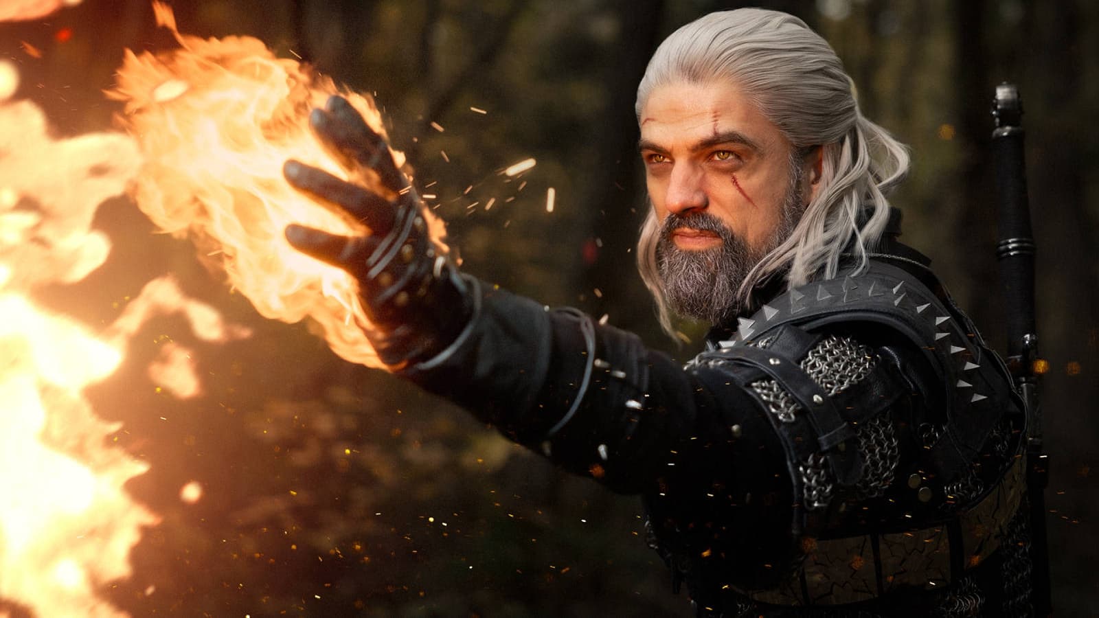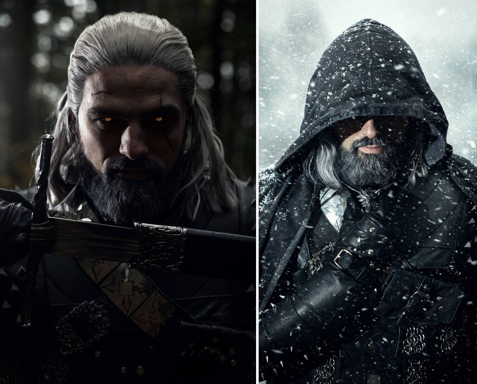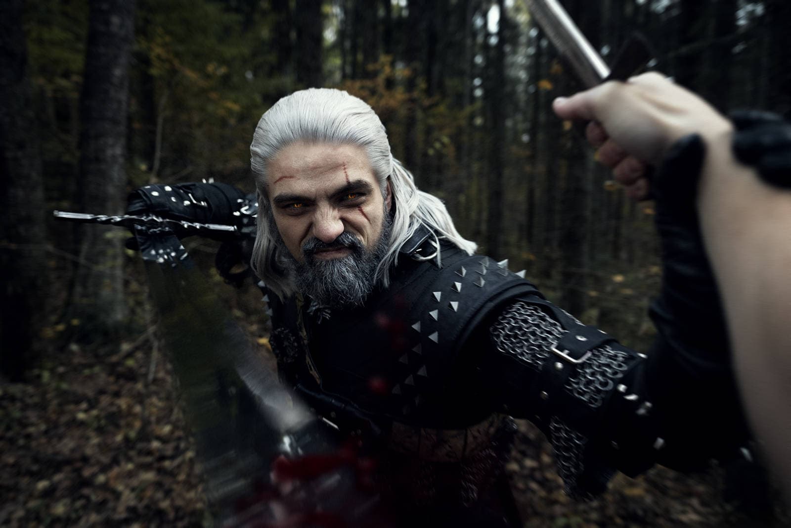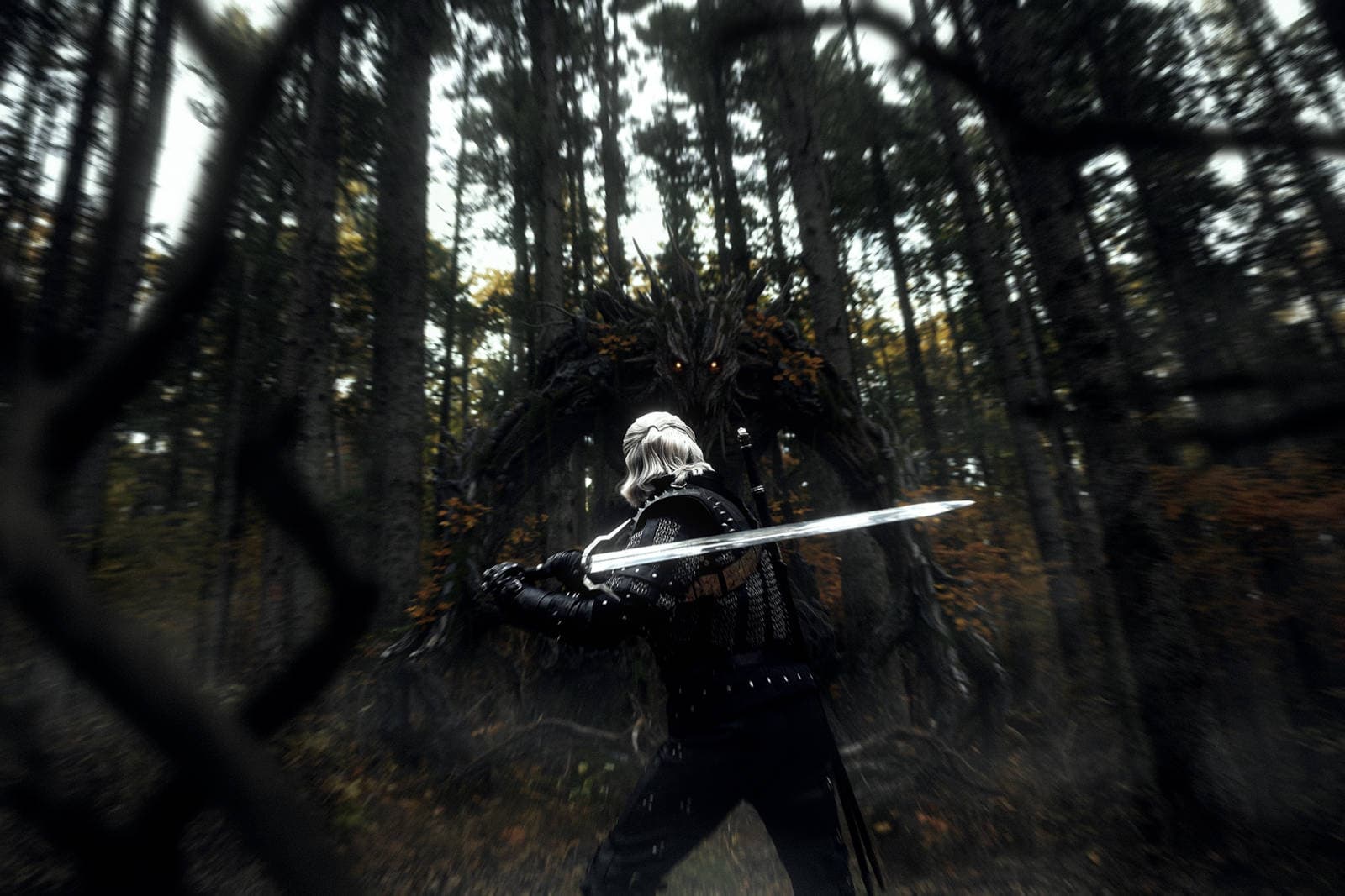 На снимках косплеер Михаил Медведев предстал в образе Геральта (скорее всего, из ролевого экшена The Witcher 3: Wild Hunt), столкнувшегося в лесу с опасным монстром, напоминающим Лешего.