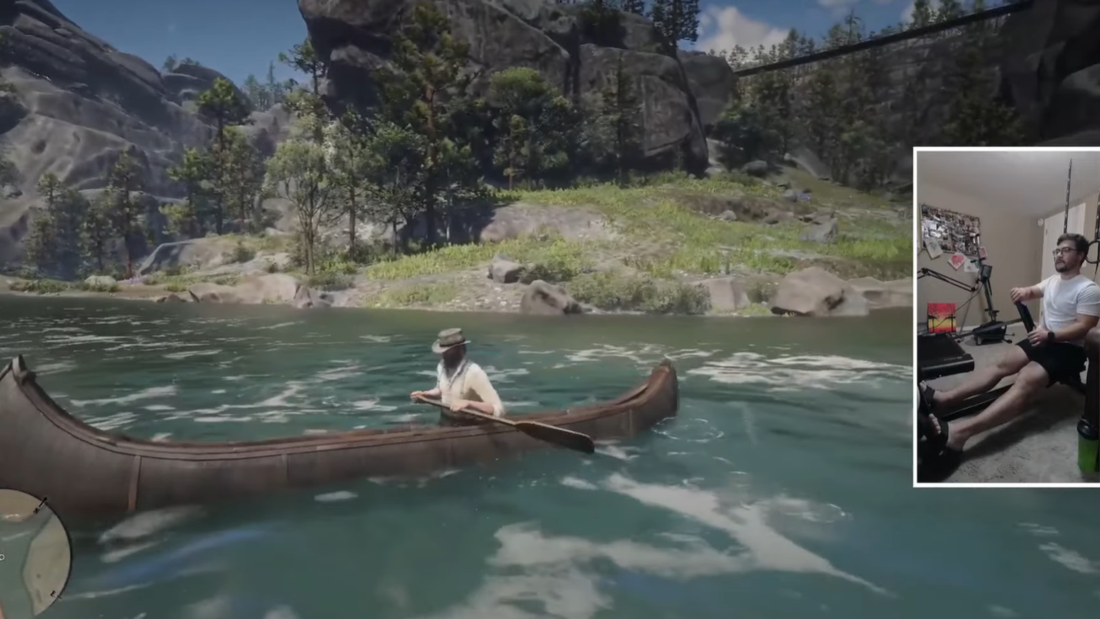 Он воспользовался гребным тренажёром. За трансляцию команд отвечала конструкция из телефона, Steam Link и приложения Steppl, переводившего движения (греблю) в реальном мире в перемещение героя на каноэ в RDR 2.