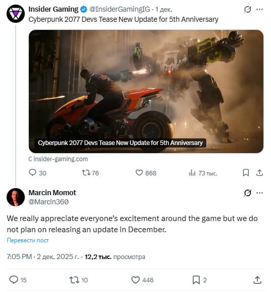 Игроков, рассчитывавших на декабрьское обновление Cyberpunk 2077, ждёт разочарование. Марцин Момот из CD Projekt RED прокомментировал волну слухов в сообществе.
