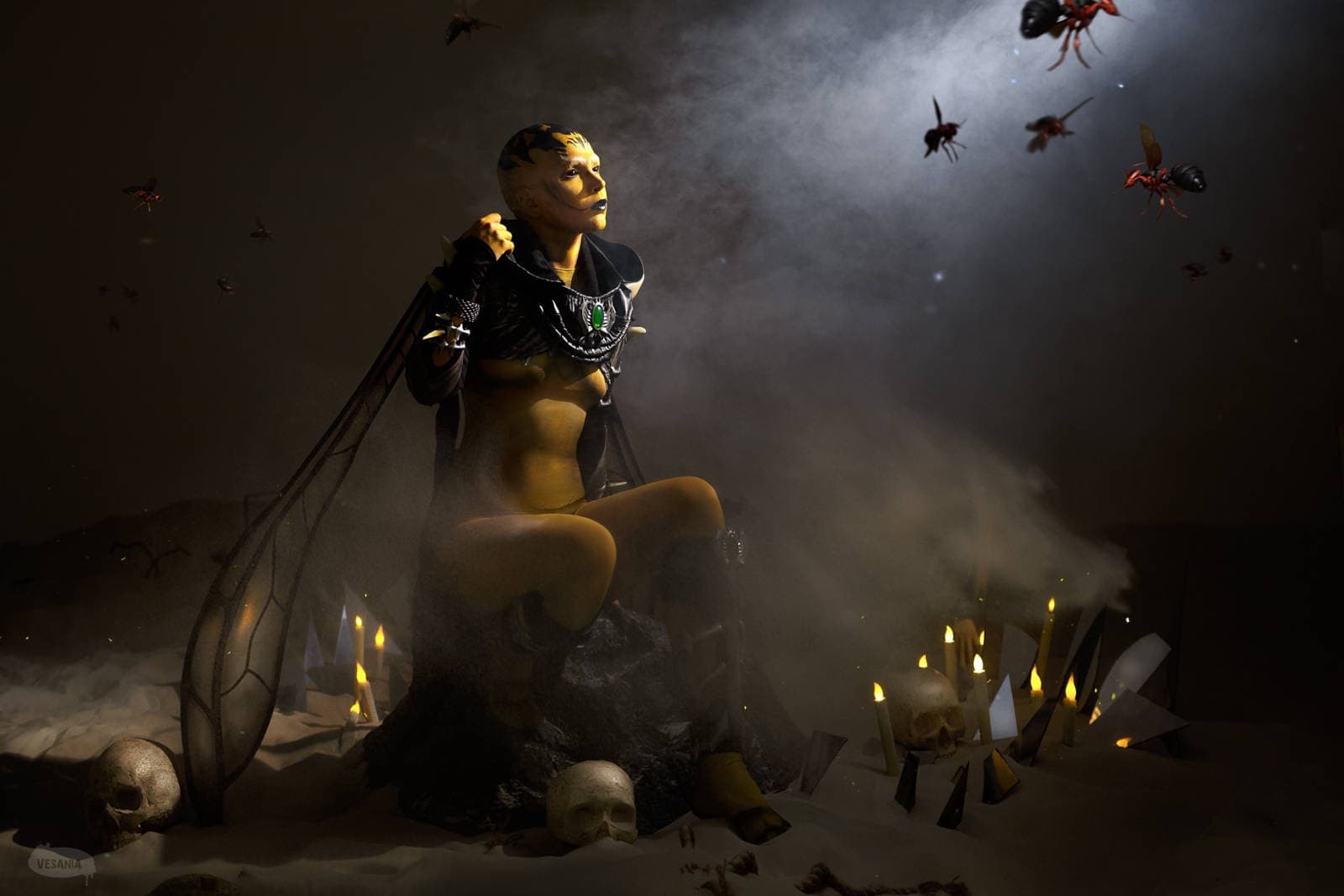 Во время фотосессии модель перевоплотилась в Ди'Вору — представительницу расы китинн, людей‑насекомых из царства Арнык.