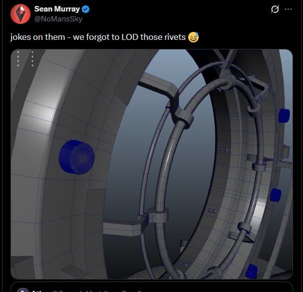 Мюррей прикрепил скриншот модели из редактора NMS, где видно, что заклепки на телепорте имеют избыточно высокую детализацию — тысячи полигонов вместо оптимизированной версии. Таким образом, если модель действительно украдена, то и производительность в Once Human может пострадать.