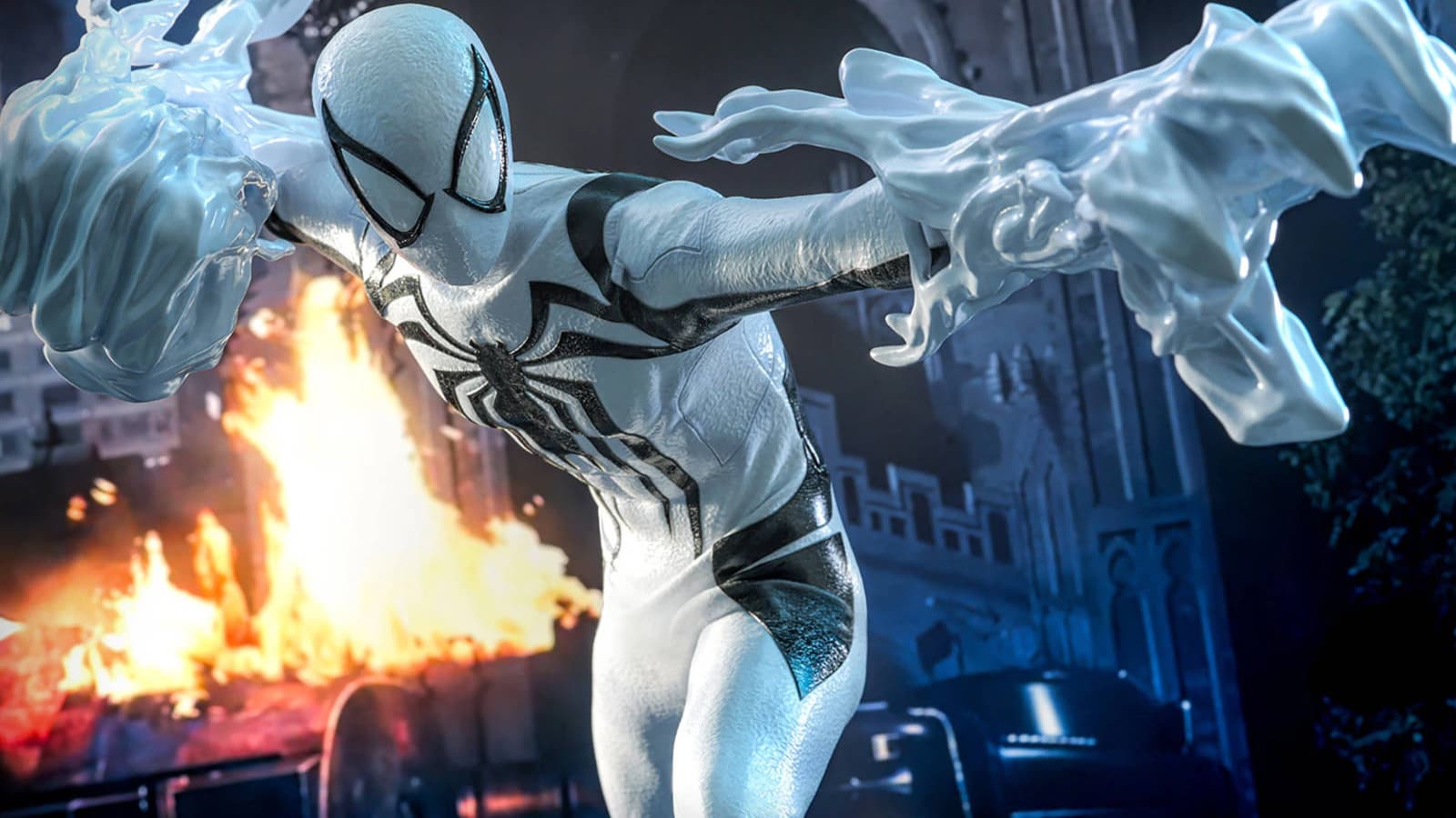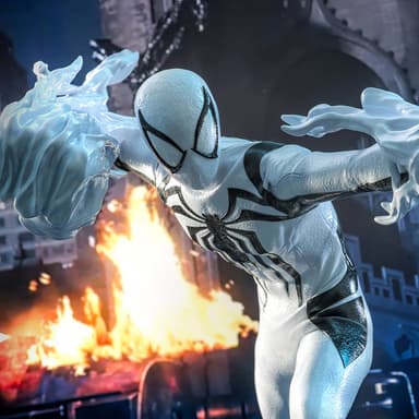Также в комплекте есть костюм Человека-паука перламутрового белого цвета с черными вставками и эмблемой паука на груди, десять съемных частей симбиота белого цвета (крепятся к спине).