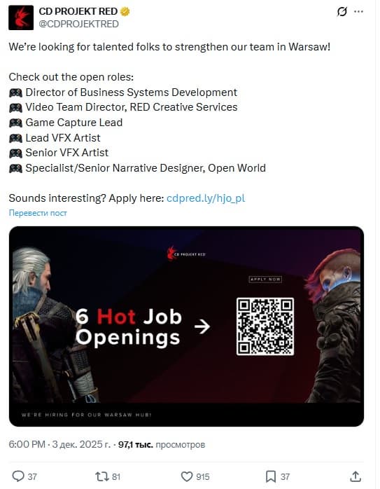 Вакансии открыты не только в Польше, но и в США и Канаде. CD Projekt RED ищет сотрудников для всех ключевых проектов: The Witcher 4, Cyberpunk 2, а также таинственного мультиплеерного проекта во вселенной Ведьмака.