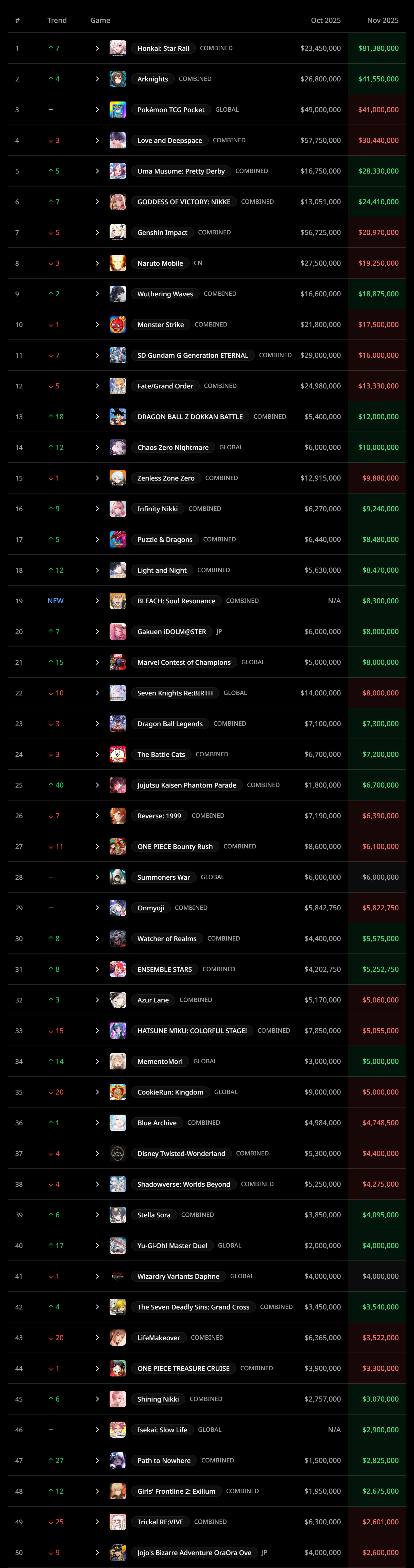 Список самых прибыльных гача-игр за ноябрь 2025 года. Учитываются данные только с мобильных устройств: