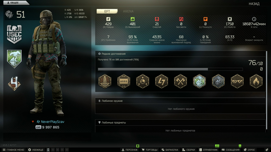 Игрок под ником NeverPlayScav стал первым, кому удалось выйти на самый лучший финал в PvP-режиме. Запись рейда на Терминале он выложил на Ютубе. Казалось бы, повод для поздравлений, но после просмотра статистики весь энтузиазм куда-то пропадает — у его персонажа 86 K/D и 93% выживаемости. До лучшей концовки он дошёл за 429 рейдов и погиб всего 21 раз.