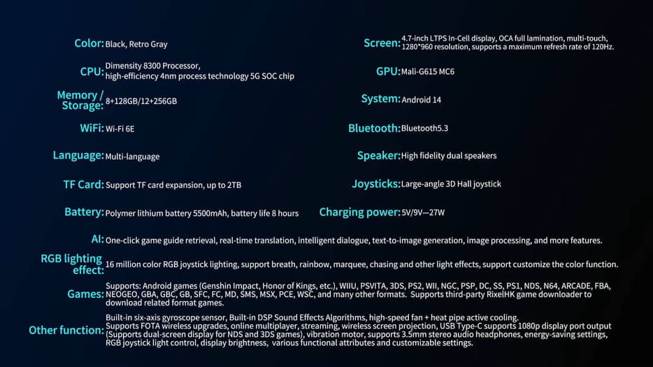 Консоль также получит 8–12 ГБ оперативной памяти, 128–256 ГБ встроенной памяти, Wi‑Fi 6E, Bluetooth 5.3, стики на датчиках Холла с большим углом наклона, поддержку карт TF до 2 ТБ, высококачественные стереодинамики, встроенный шестикоординатный гироскоп, высокоскоростной вентилятор и тепловую трубку с активным охлаждением.