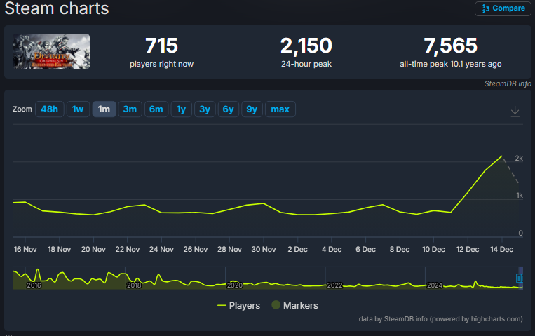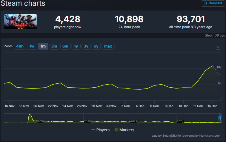 Анонс новой игры во вселенной Divinity от Larian Studios заметно повлиял на активность игроков и вызвал рост интереса к предыдущим частям серии. Вскоре после показа трейлера на The Game Awards Divinity: Original Sin 2 существенно прибавила в онлайне и вернулась в чарты Steam.