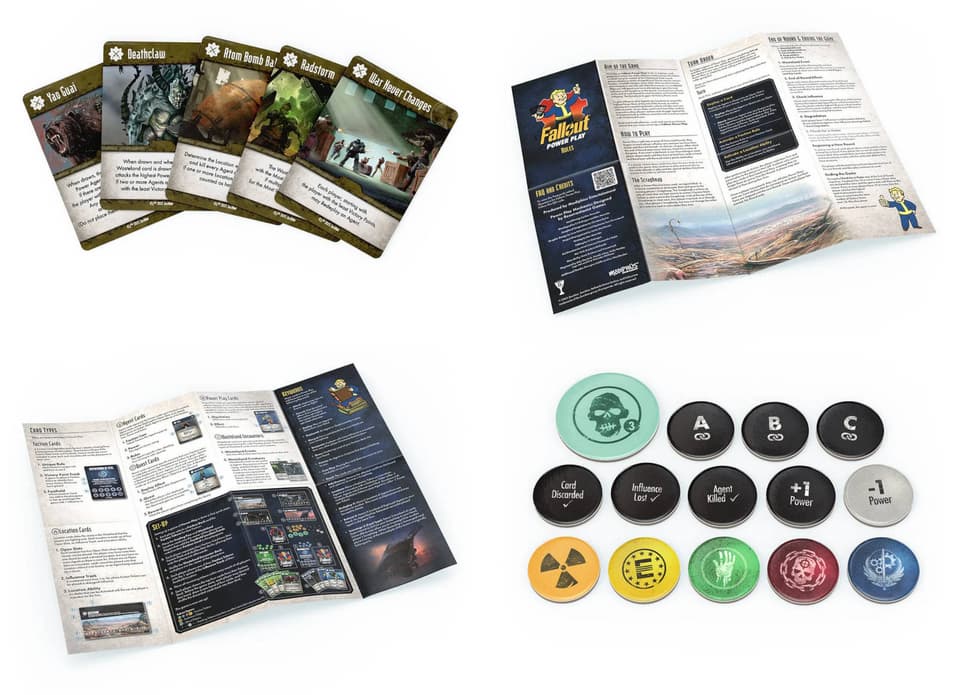 Внутри коробки получится отыскать 100 карт фракций, 10 карт Пустоши, шесть карт локаций, три листа с жетонами и флаер с правилами Fallout: Power Play.