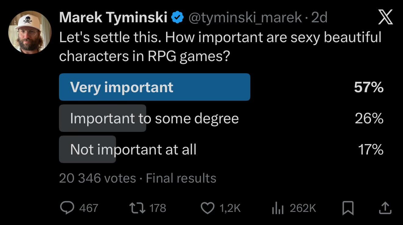 При этом журналист в своем материале сам же приводит недавний опрос, который Тыминьский устроил на своей странице в социальной сети X, где попытался узнать, нужны ли в ролевых играх сексуальные персонажи. Подавляющее большинство людей ответили «Да».