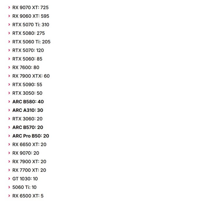Обычно лидерами продаж остаются AMD и NVIDIA, а Intel занимает нижние строчки рейтингов. Но на этой неделе Arc B580 поднялась на 12-е место, разойдясь тиражом около 40 экземпляров. Это немного по сравнению с лидерами вроде RX 9070 XT, которая продалась сотнями, но заметный рост на фоне предыдущих месяцев, когда продукты Intel почти не появлялись в подобных списках.