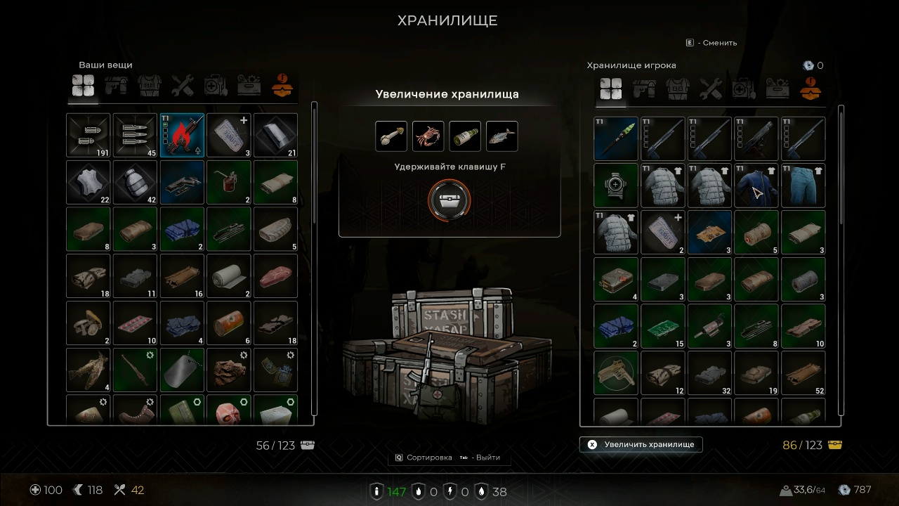 На изображении видно, что игрок сможет поэтапно расширять хранилище за ресурсы, которые он находит в мире игры. Это уберёт неприятное для многих ограничение в количестве ячеек хранилища. Как вам идея?