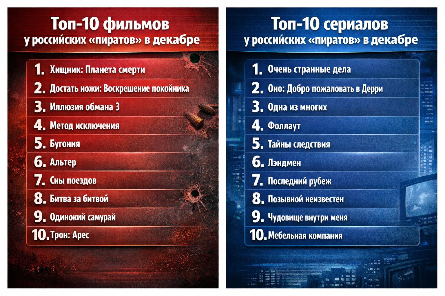 Российская компания F6 совместно с изданием Бюллетень кинопрокатчика представили декабрьский рейтинг фильмов и сериалов, которые чаще всего распространялись нелегально. Статистика отражает количество обнаруженных копий в Рунете, включая торрент-трекеры и пиратские сайты, и не указывает напрямую на число просмотров.