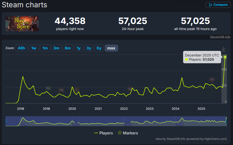 Карточный рогалик Slay the Spire установил новый рекорд одновременного онлайна в Steam спустя почти семь лет после релиза. По данным SteamDB, 27 декабря количество одновременно играющих пользователей превысило 57 тысяч человек. Для сравнения, предыдущий пик на уровне 33 тысяч был зафиксирован в 2018 году, когда проект ещё находился в раннем доступе.