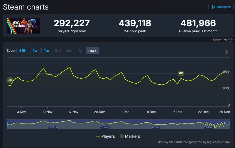 Игра вышла в октябре и достигла максимума в 481 966 игрока 16 ноября. Минимальный 24-часовой пик с момента релиза составил 272 тыс. игроков, что впечатляет.