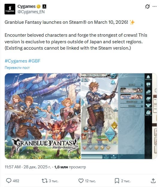 Теперь официально подтверждено, что оригинальная Granblue Fantasy 2014 года выйдет в Steam. Релиз запланирован на март 2026 года. Версия ориентирована на новых игроков — существующие аккаунты Cygames подключить нельзя.