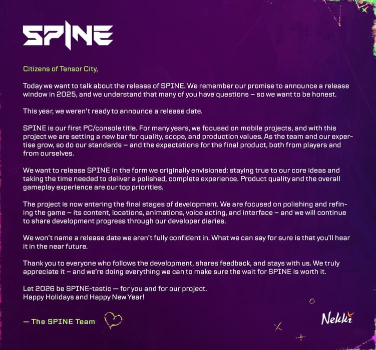 Работы близятся к финалу: SPINE - This is Gun Fu входит в заключительный этап производства, где вносятся последние исправления. Точная дата релиза пока не объявлена, но команда обещает вскоре раскрыть новые подробности.