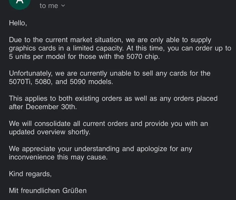 По словам одного европейского продавца на Reddit, немецкий дистрибьютор заявил, что не может продавать карты RTX 5070Ti, 5080 и 5090. В результате отменены существующие заказы и все новые, оформленные после 30 декабря. Он отметил, что скоро видеокарты станут дорогими.