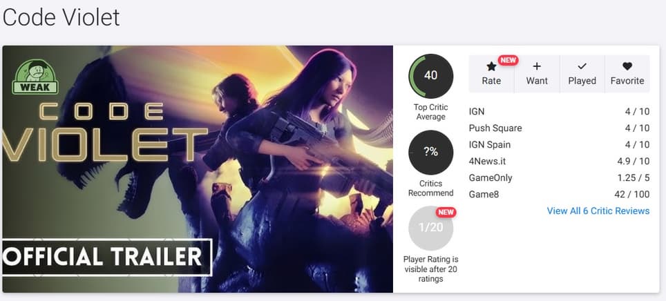 Сразу после релиза отмечались слабая графика, проблемы с производительностью и короткая сюжетная кампания — менее трёх часов. Первые обзоры на Opencritic подтвердили опасения: средний рейтинг Code Violet на момент публикации новости составляет 40%. Критики называют игру недоделанной и преждевременно выпущенной.