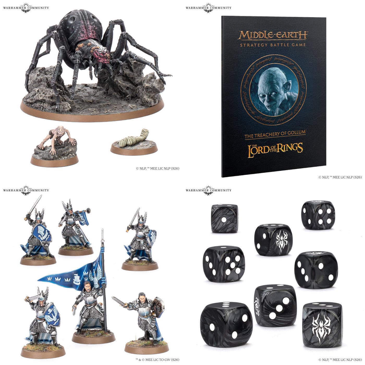 Поклонники Middle-earth Strategy Battle Game смогут приобрести пластиковые миниатюры Шелоб, Голлума и Фродо, оплетённого паутиной, 48-страничный журнал «Предательство Голлума» с девятью сюжетными сценариями, набор из шести смоляных рыцарей Дол Амрота и тематические кубики в стиле Кирит Унгола.