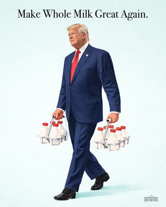 Пост появился после пресс-конференции, на которой Трамп объявил о возврате к полной жирности молока. Он также опубликовал другие мемы и видео, включая ИИ-клипы с политиками, пьющими молоко.