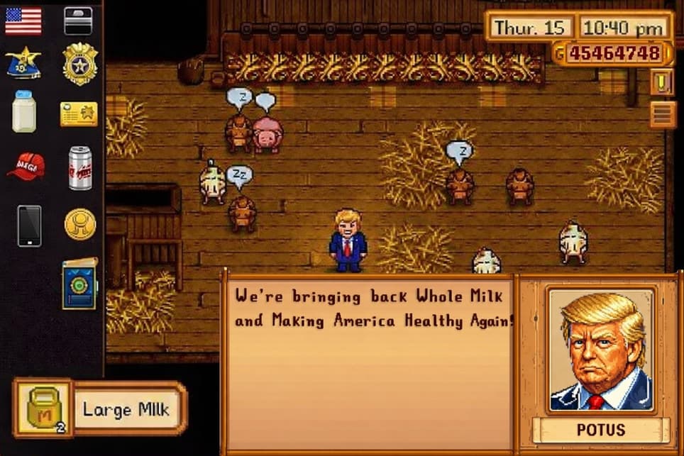 На картинке, выполненной в эстетике популярного симулятора фермы, была фраза «Make Whole Milk Great Again», приуроченная к отмене ограничений на цельное молоко в американских школах.
