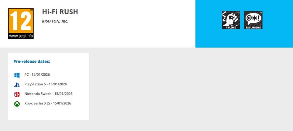 После того как издателем проекта стал Krafton, на сайте европейского рейтингового агентства PEGI появилась информация, указывающая на возможный релиз Hi-Fi Rush не только на PC, PS5 и Xbox Series X|S, но и на первую Nintendo Switch.