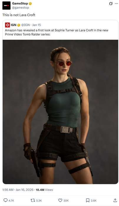 После публикации первого кадра с Софи Тёрнер в образе Лара Крофт из будущего сериала Tomb Raider в сети разгорелись споры о том, подходит ли актриса для этой роли. В обсуждение неожиданно включилась и торговая сеть GameStop, известная своей любовью к провокационным постам в соцсетях.
