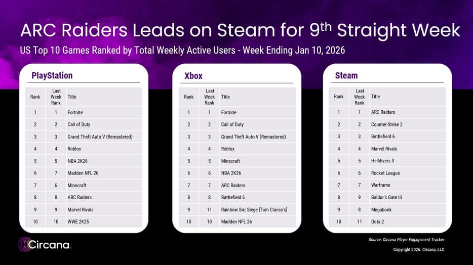 Circana Player Engagement Tracker подтверждает, что ARC Raiders удерживает первое место в Steam девятую неделю подряд. Единственной франшизой, способной реально конкурировать, называют GTA VI с GTA Online, но точные детали релиза пока неизвестны.
