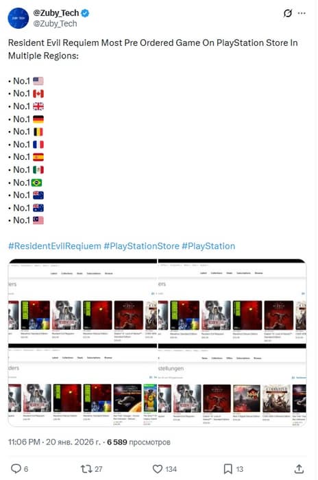 Лучше всего это видно по крупнейшим рынкам. Resident Evil Requiem поднялась на первое место в чартах предзаказов PlayStation Store многих стран, включая США, Великобританию, Германию, Францию и Испанию.