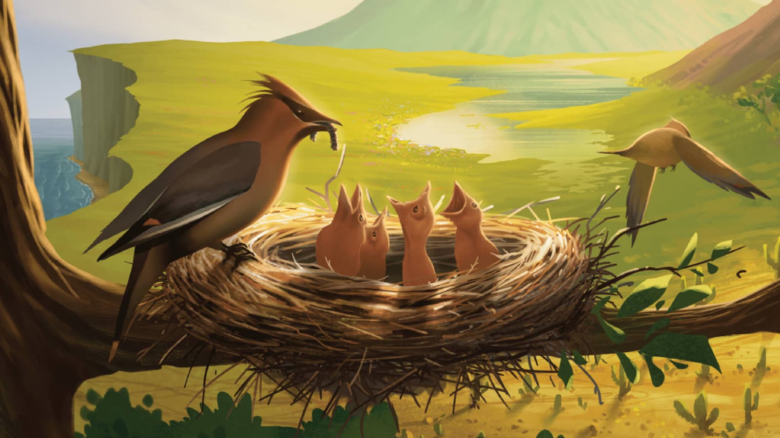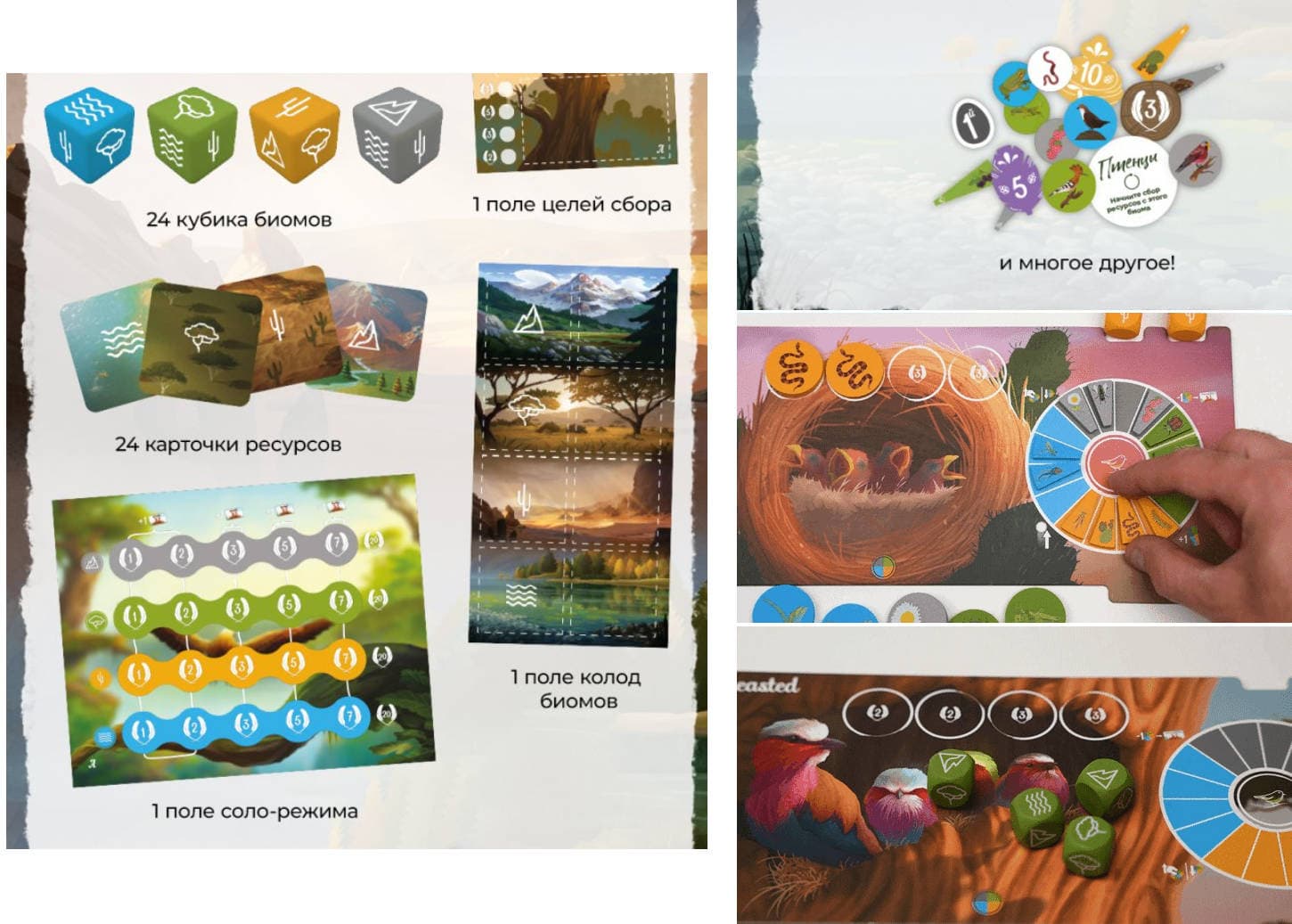 Это стратегическая евро-настолка с механиками размещения кубиков и контроля территорий для 1–4 человек, в которой участники будут собирать ресурсы для кормления птенцов и выполнения целей.