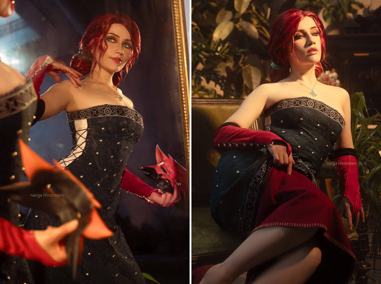 На фотографиях Narga Aoki предстала в эффектном платье, предназначенном для бала-маскарада, и маске лисы, которую ведьмак приобрел у эльфийского торговца и портного Элихаля.