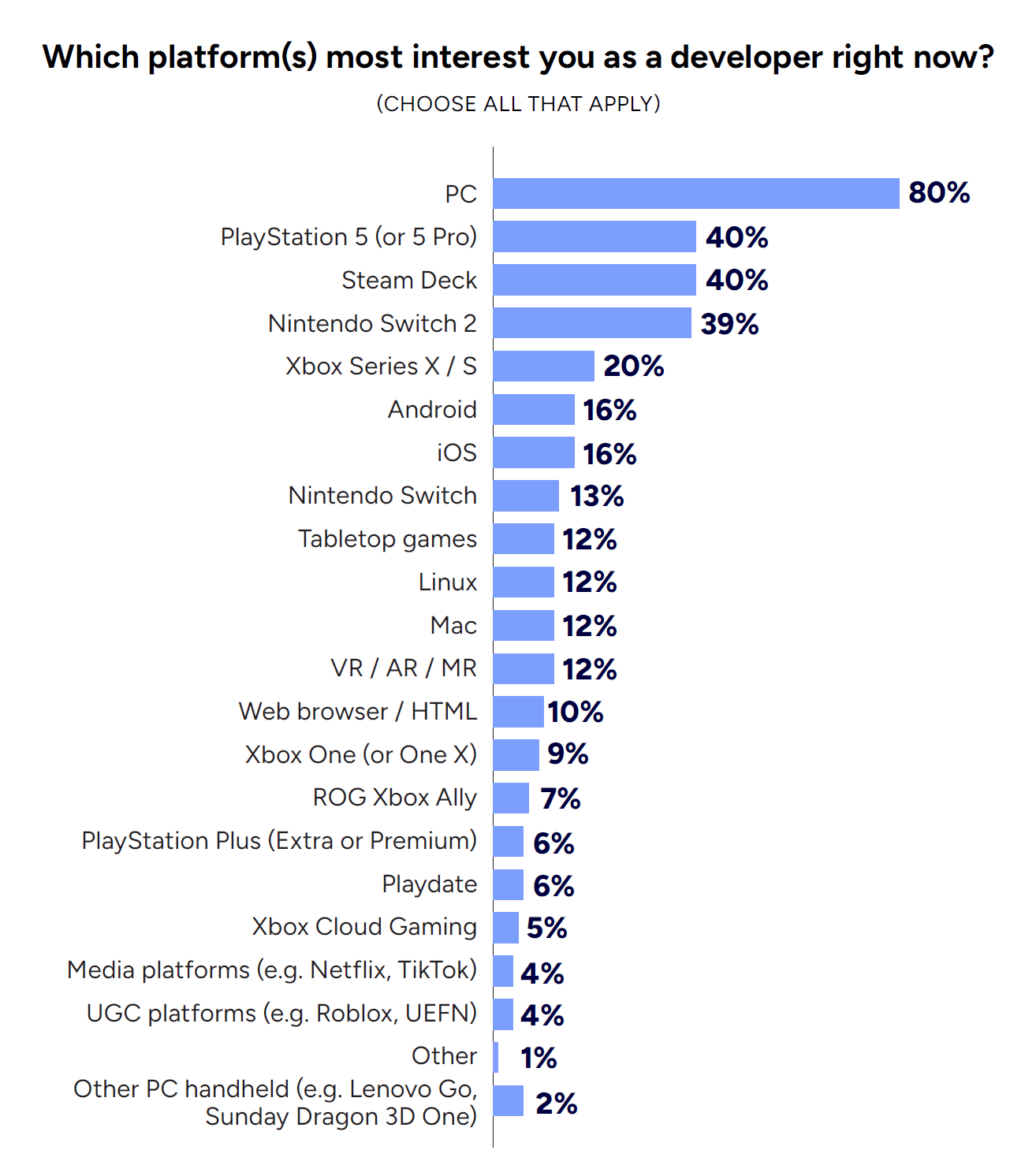 В исследовании приняли участие более 2,300 профессионалов игровой индустрии со всего мира. Им предложили отметить платформы, на которых им было бы интересно работать в данный момент, без ограничения на количество вариантов — то есть без необходимости выбирать что-то одно.